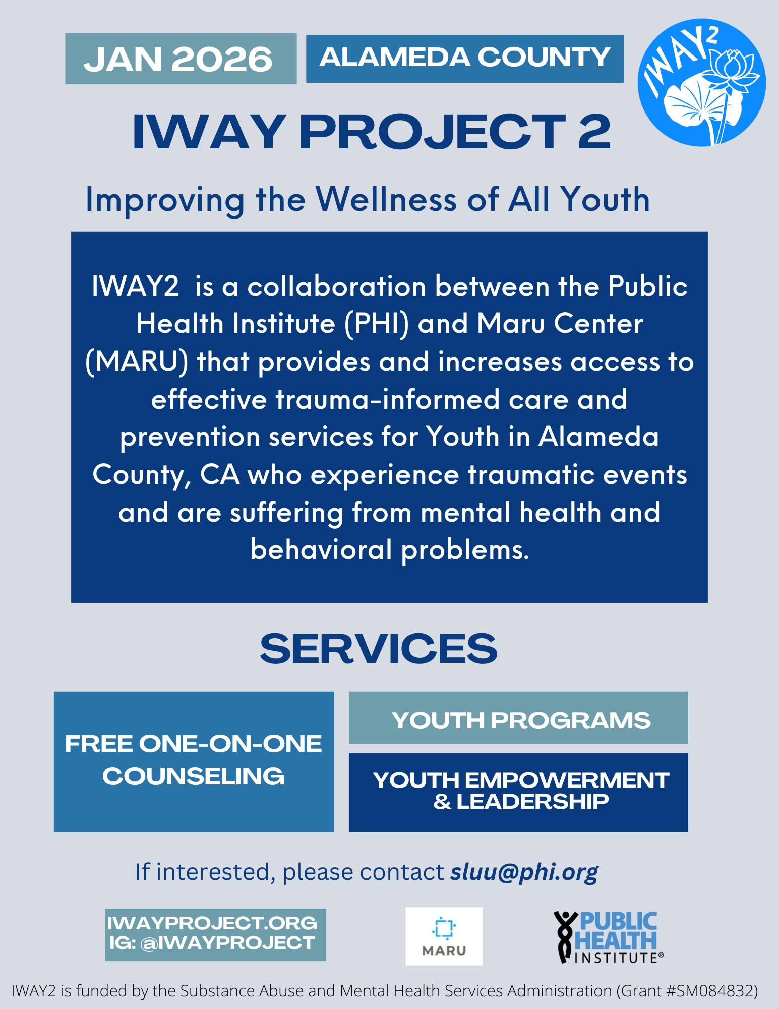 IWAY2 is a collaboration between the Public Health Institute (PHI) and MARU Center (MARU). We aim to provide and increase access to effective trauma-informed care and prevention services to Youth in Alameda County.