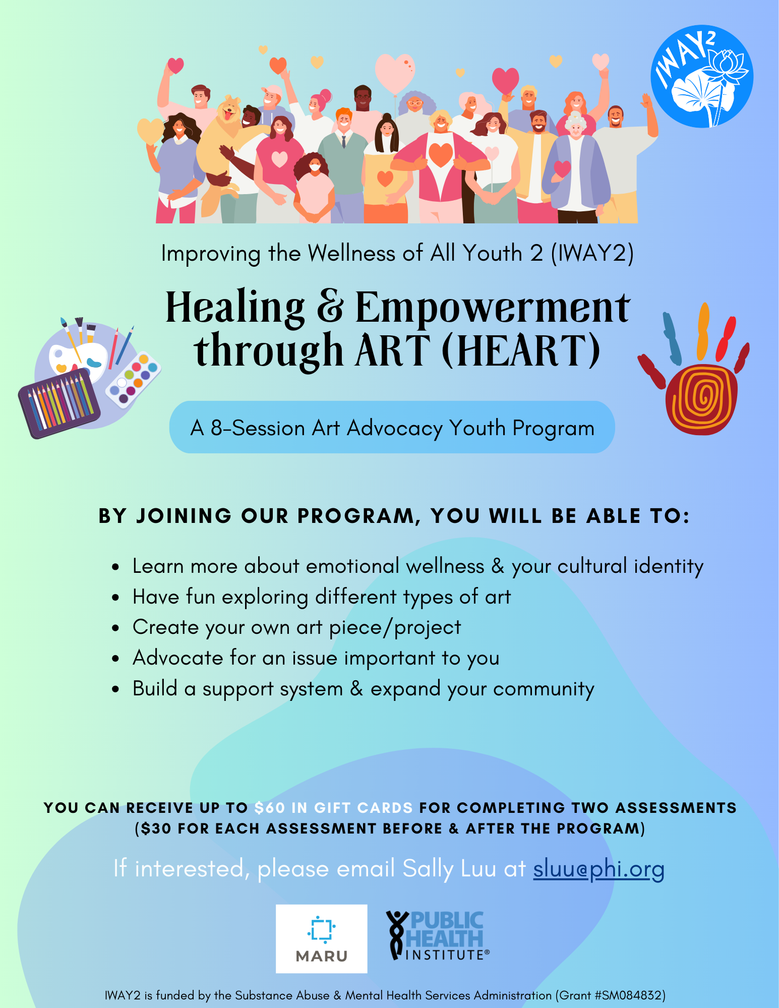 The Healing & Empowerment through ART (HEART) program is an ongoing youth empowerment program that we are launching in Alameda County high schools. Art can be a very powerful tool that allows one to better understand and process certain experiences and emotions that may be difficult to put into words. The HEART program is a unique opportunity for youth to have fun creating art while gaining a better understanding of their own mental health and wellness, cultural background, and advocacy.